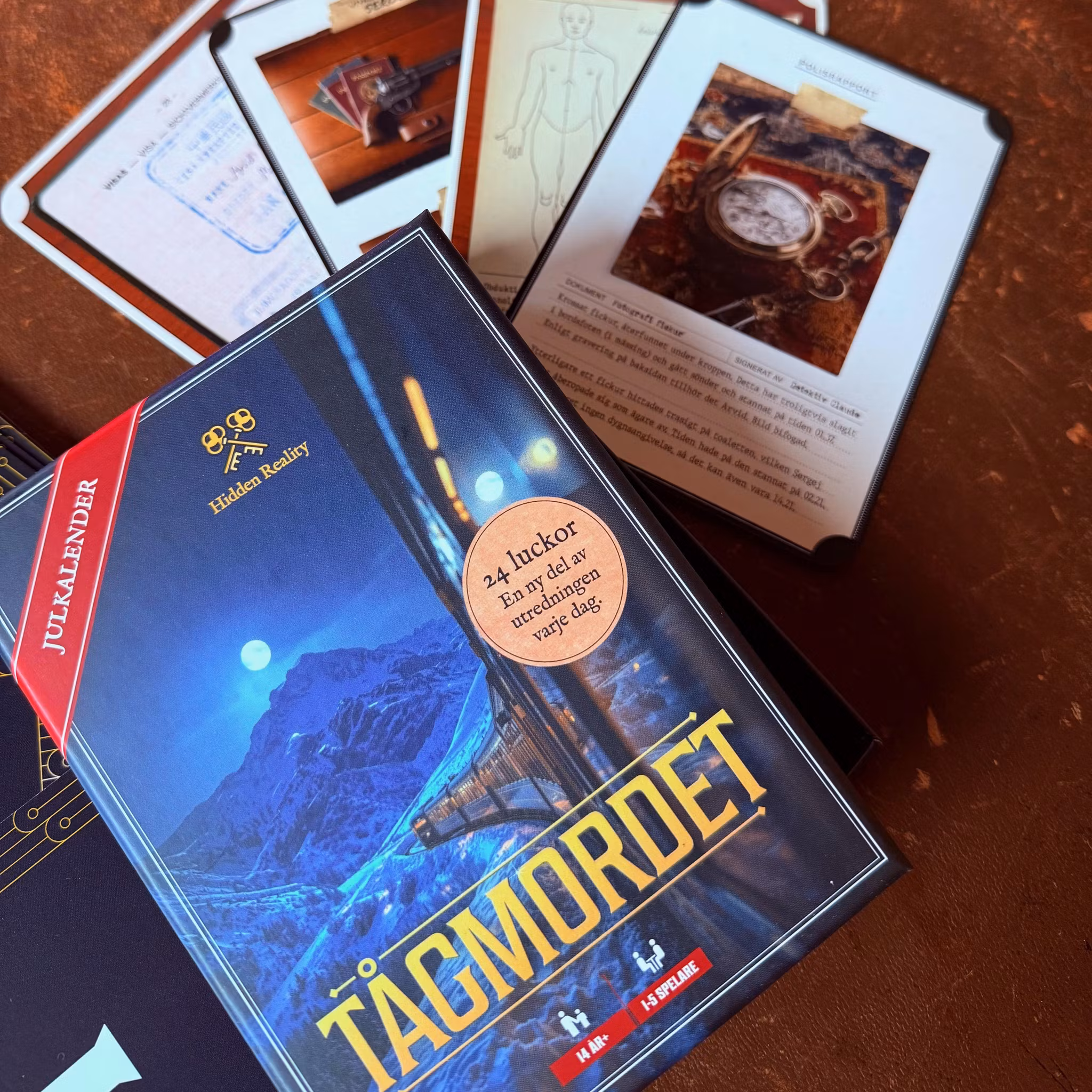 Lådan innehåller 24 spelkort ("luckor") med nya ledtrådar varje dag, samt facit och annat bonusmaterial.